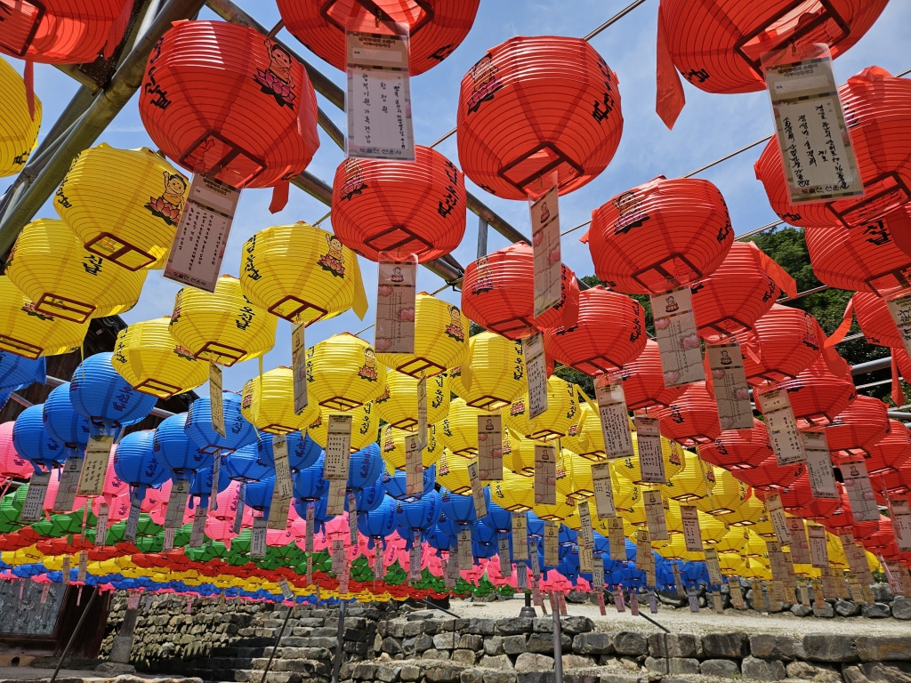 다채로운 등불이 매달린 사찰 풍경,